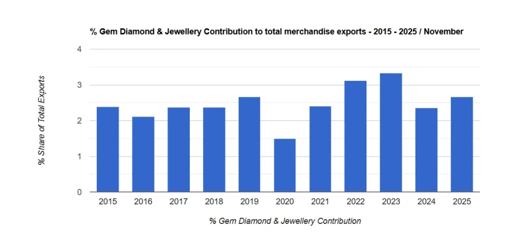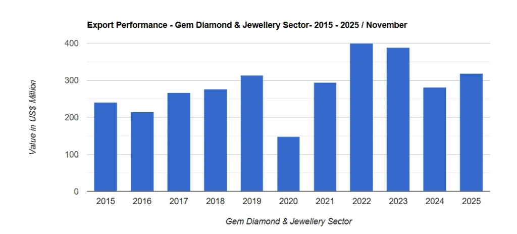 The gem and jewellery sector has demonstrated resilience, with provisional data showing USD 310.52 million in earnings from January to September 2025. This builds on USD 360 million for the full year 2024 and USD 475 million in 2023, indicating gradual recovery driven by improved formal channels and international buyer interest.